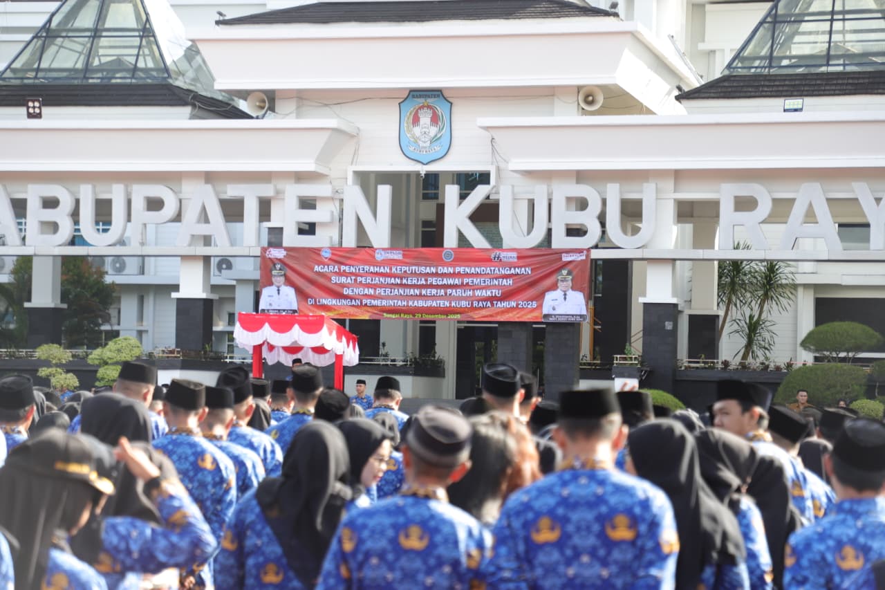 Gagasankalbar.com – Pemerintah Kabupaten Kubu Raya secara resmi menyerahkan Keputusan pengangkatan sekaligus melakukan penandatanganan Surat Perjanjian Kerja (SPK) bagi Pegawai Pemerintah dengan Perjanjian Kerja (PPPK) Paruh Waktu di lingkungan Pemerintah Kabupaten Kubu Raya Tahun 2025. Kegiatan tersebut berlangsung di Halaman Kantor Bupati Kubu Raya, Kecamatan Sungai Raya, Senin (29/12/2025).